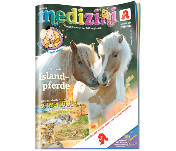 Alles, was Kinder interessiert, ist auch ein Thema für medizini. Dazu gibt es Gesundheitsinfos, ein großes Tier- und Wissensposter sowie Rätsel, Witze und Bastelanleitungen.