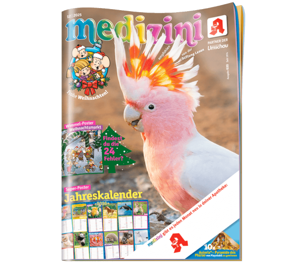 Alles, was Kinder interessiert, ist auch ein Thema für medizini. Dazu gibt es Gesundheitsinfos, ein großes Tier- und Wissensposter sowie Rätsel, Witze und Bastelanleitungen.