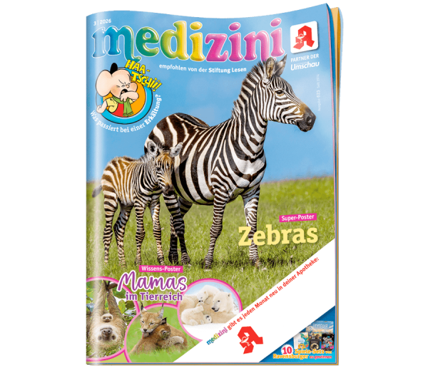 Alles, was Kinder interessiert, ist auch ein Thema für medizini. Dazu gibt es Gesundheitsinfos, ein großes Tier- und Wissensposter sowie Rätsel, Witze und Bastelanleitungen.