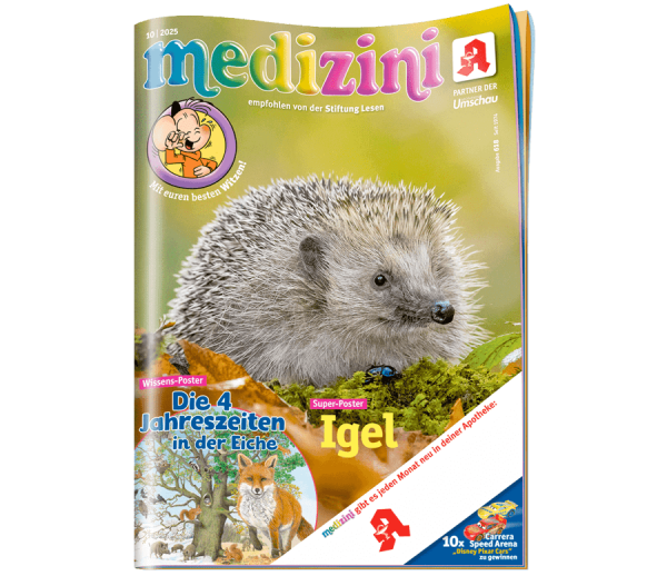 Alles, was Kinder interessiert, ist auch ein Thema für medizini. Dazu gibt es Gesundheitsinfos, ein großes Tier- und Wissensposter sowie Rätsel, Witze und Bastelanleitungen.