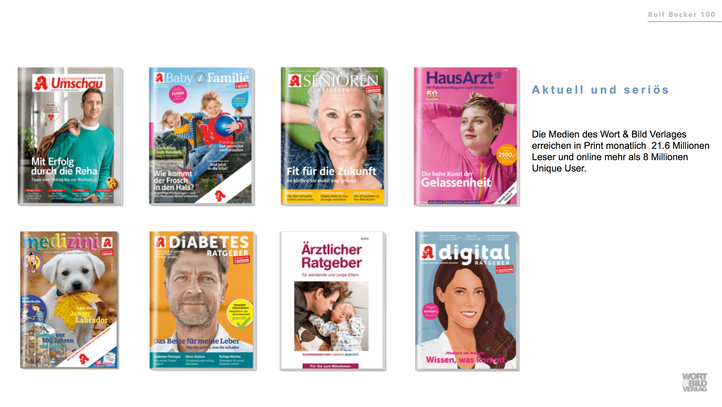 Mit der größten Gesundheitsredaktion Europas bieten die Magazine des Wort & Bild Verlags seriöse Information auf wissenschaftlicher Basis, einfach und laienverständlich aufbereitet. Das Credo Rolf Beckers gilt heute genauso wie vor 60 Jahren: „Das erworbene Wissen soll jedem helfen, durch gesunde Lebensführung Schäden von vornherein zu vermeiden.“
