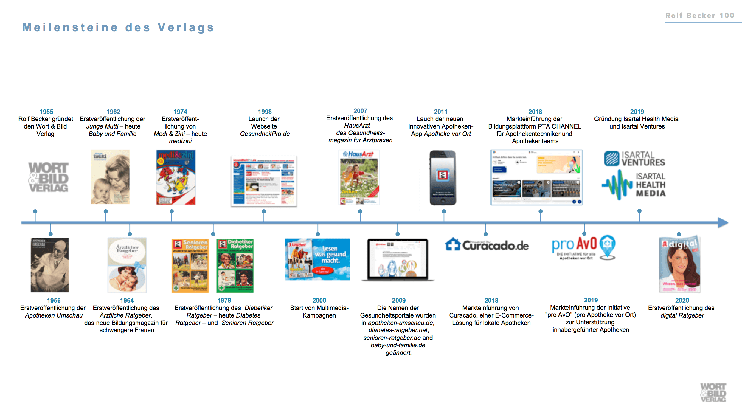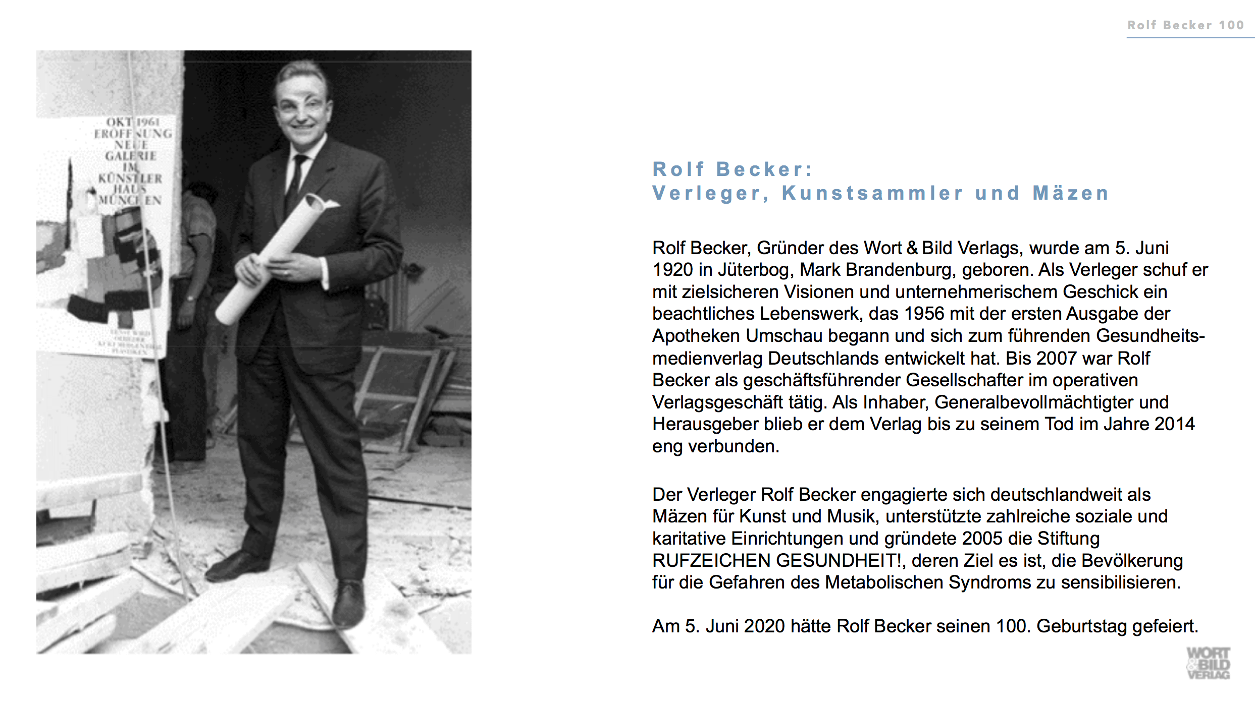 Der Wort & Bild Verlag ehrt einen großen Visionär und Vordenker: Der Gründer des Verlags, Rolf Becker, hätte am 5. Juni 2020 seinen 100. Geburtstag gefeiert. Als er 1956 die Apotheken Umschau auf den Markt brachte, hatte die Erstausgabe des Magazins eine Auflage von 50.000 Exemplaren. Heute ist die Apotheken Umschau mit 19 Millionen Leserinnen und Lesern monatlich das reichweitenstärkste Magazin Deutschlands.