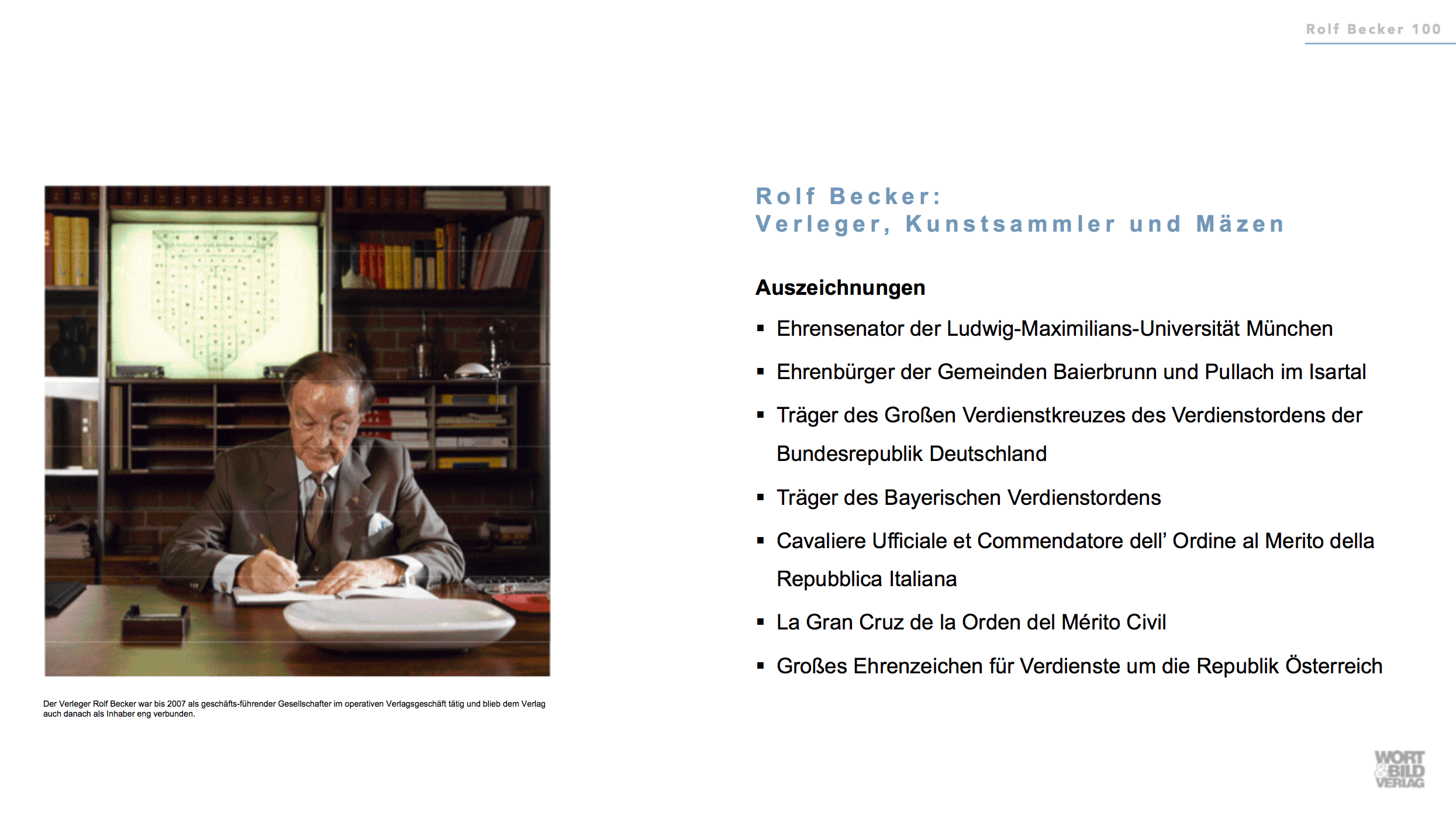 Die gesamte Präsentation zum 100. Geburtstag von Verleger Rolf Becker können Sie hier herunterladen.